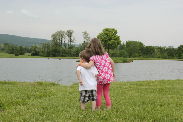 We took the hayride back to the main part of the farm to pay for our strawberries (both of those containers above cost us $2 total! I wish I'd bought 3 times as much). At that point I realized we'd been there over 3.5 hours, we'd eaten all of our snacks, and it was definitely time to get home. When walking back to the car we noticed a pond near the parking lot, and wanted to go look at the geese swimming in the pond. I was able to get this shot below of the kids (along with a few others, but this is my favorite). Man I love these kids.
