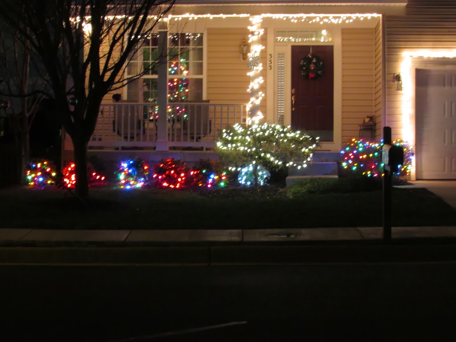 For the last part of our walk, she took the camera off the tripod again and took some regular exposures. Because of that and the lack of street lights near these houses, the only things that can be seen in these photos are the Christmas lights, but I really like that look! It's as if nothing else is there.